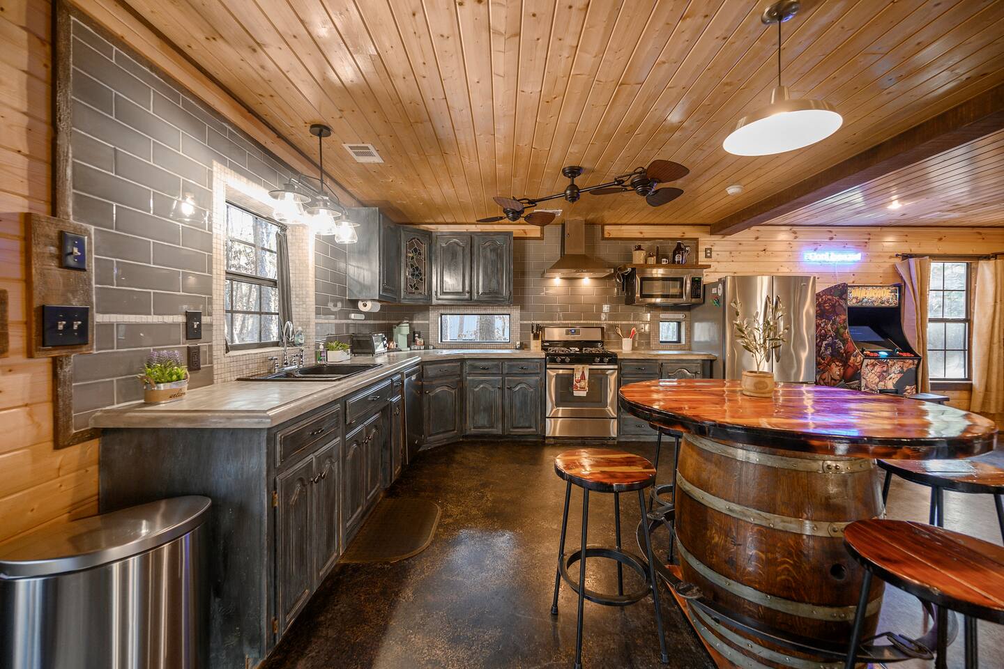 🌲Most-loved family cabin in Hochatown!🌲 🌲Secluded 🔥Fire Pit 🌲Towering Pine Trees ♨️Hot Tub 📍Within the Ouachita 🛏Jumbo 2 bd National Forest 📶Wifi 🕹Arcade w/ 4700+ games 🤯Wraparound Porch 🚿Subway Tile Shower ⚜️Rustic Industrial Design 🌽Stone Cornhole 🛋 Sofa Bed 🤯Wraparound Porch 🪑Elevated Patio 👑King Bed & 2 Queens 🎹Piano 📍<0.5 mi from HWY 259 📘Custom Guidebook